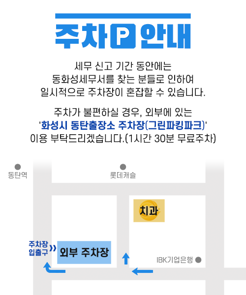 CONTACT US DONGTAN CENTRAL DENTAL HOSPITAL 주소 경기 화성시 동탄오산로 86-3, 504~506호 진료시간 월/화/수/목 AM 10 : 00 ~ PM 08 : 30 금요일 AM 10 : 00 ~ PM 07 : 00 토/일 AM 09 : 00 ~ PM 02 : 00 점심시간 PM 01 : 00 ~ PM 02 : 30 ※ 토, 일, 공휴일은 점심시간 없이 진료합니다.※ 공휴일 진료는 전화문의 주세요.